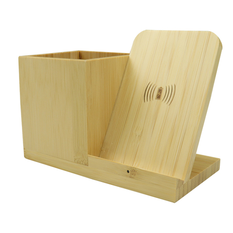 Custom 15W Draadloze Oplader Bamboe Pen Case Office Desktop Tunnel Penhouder Custom Logo Unieke Draadloze Oplader Pen Container
